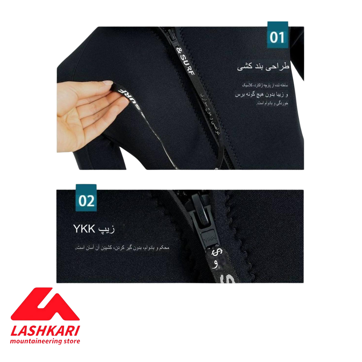 زیپ YKK و یقه CR الاستیک → جلوگیری از ورود آب و افزایش دوام